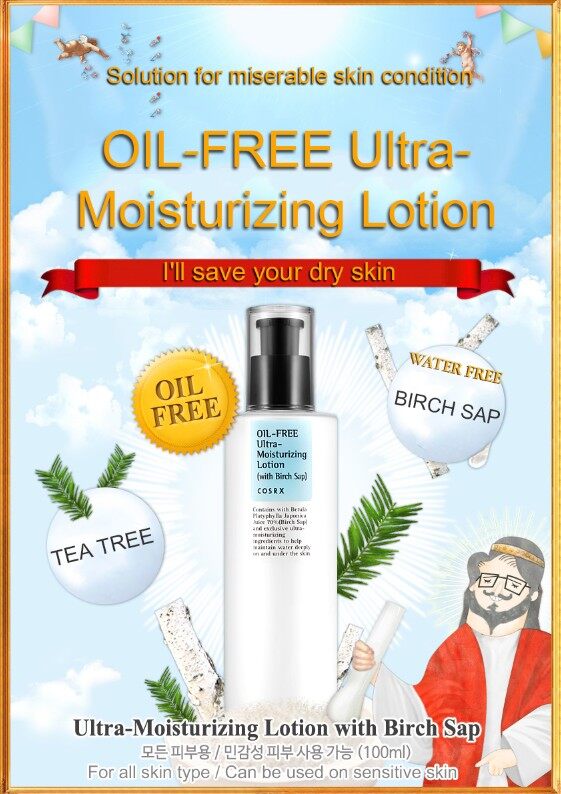 - Daily Moisturizer for all skin types The lotion is quickly absorbed into the skin without leaving any greasy residue, which makes it perfect for anyone with oily and combination skin. For dry skin, COSRX Oil Free Ultra Moisturizing Lotion can be a simple everyday staple as well since birch sap is effective in restoring moisture and maintaining hydration level.