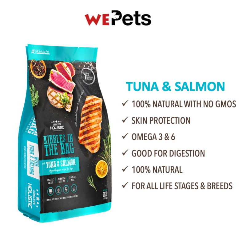 Kibbles in the bag - Tuna & Salmon:Introducing an all new revolutionary recipe formulated to provide your pet with a complete and balanced diet for life stages. Made with energy-rich ingredients including wild ocean fish that guarantees an optimal level of omega-3 and omega-6 to provide essential fatty acids to benefit your dogs inside and out. Every bag also contains wholesome cereals, FOS (fructooligosaccharides) and Yucca Schidigera to support digestion and prevent intestinal problems while also reducing inflammation with the presence of prostaglandins. Additionally, with the perfect balance of biotin and zinc, this diet is great for dogs of all lifestyles and tackles sensitive skin such as dandruff, itching, dermatitis etc.