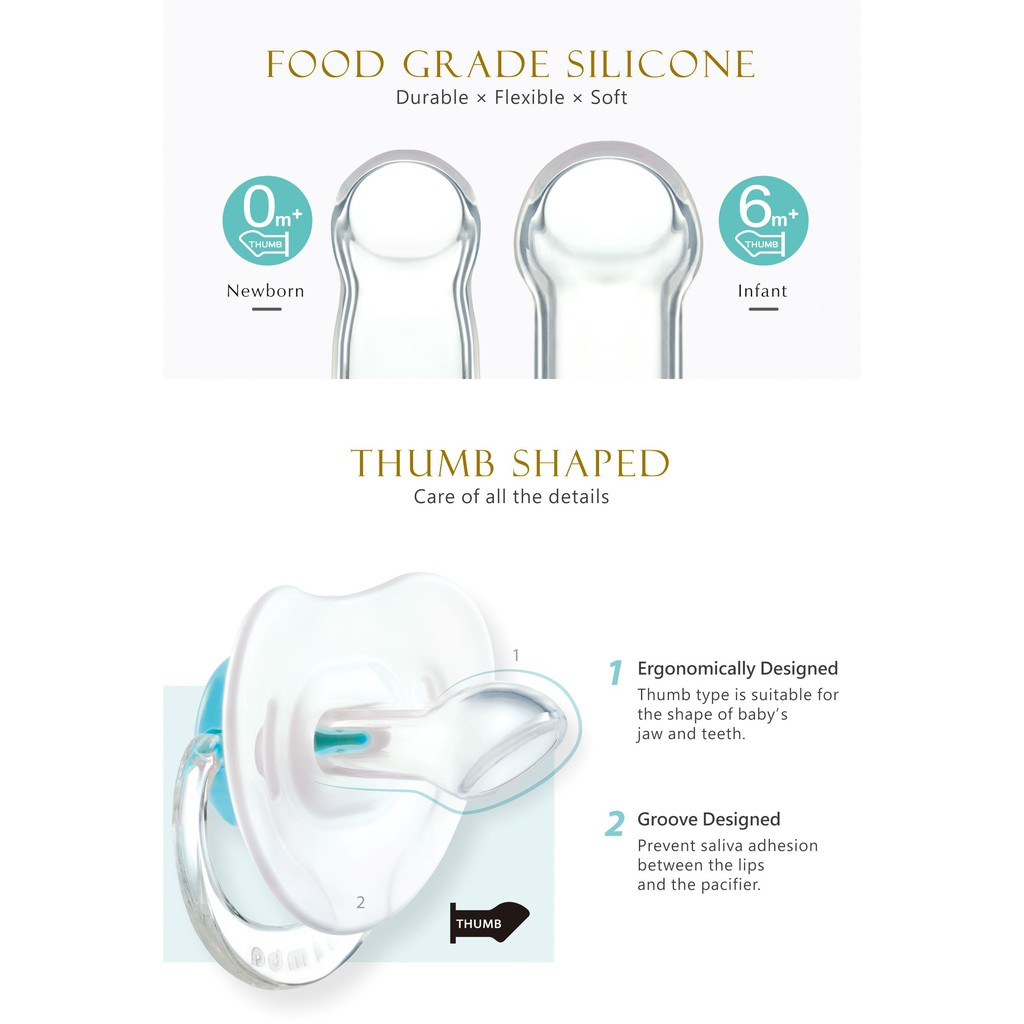●Feature1.Made of food grade silicone, SGS certified all parts are BPA Free. 2.Thumb type is suitable for the shape of baby’s jaw and teeth.3.It store hygiene with case, avoid to stains. ●MaterialPacifier:Silicone (-20℃~+120℃)Pull ring:Tritan (-20℃~+100℃)Plastic sheet‧Plug‧Case:Polypropylene (-20℃~+100℃)