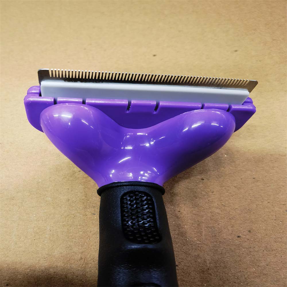 Stainless steel deShedding edge reaches through topcoat to safely and easily remove loose hair and undercoat
