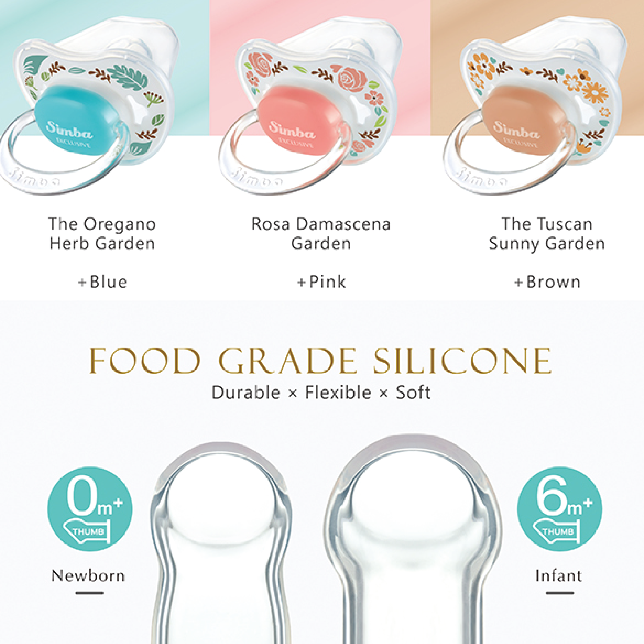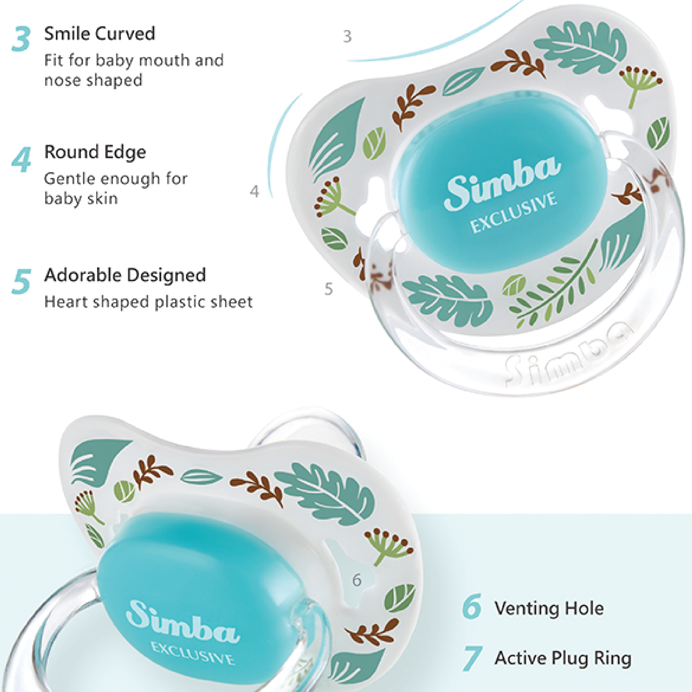 ●Thumb Shaped: Suitable for the shape of baby’s jaw and teeth. Groove design prevents saliva adhesion between lips and pacifier.
