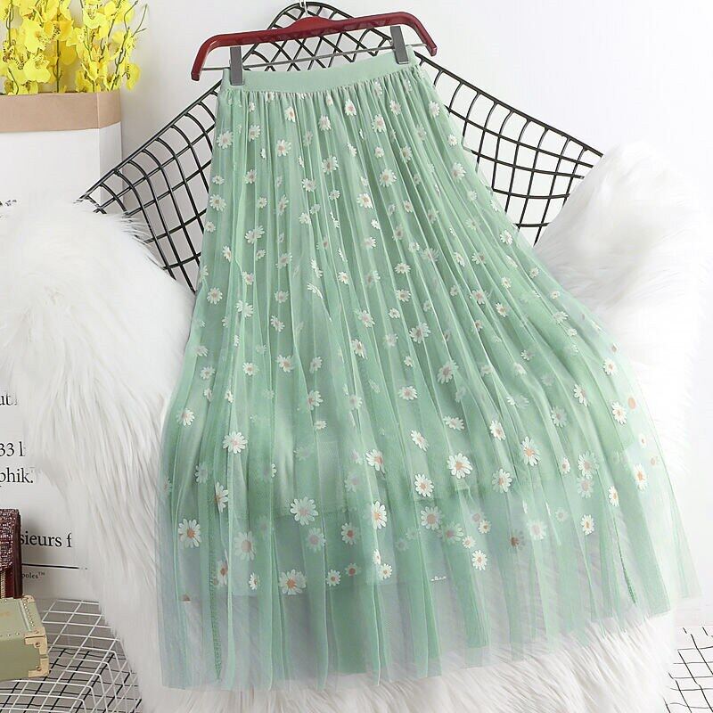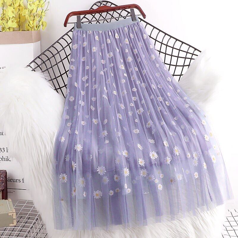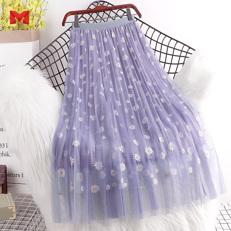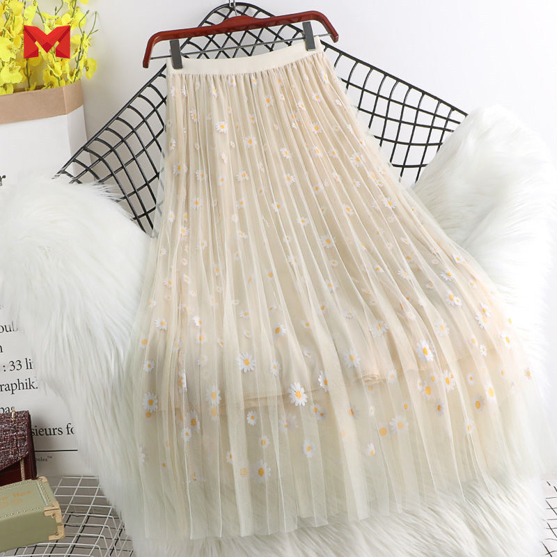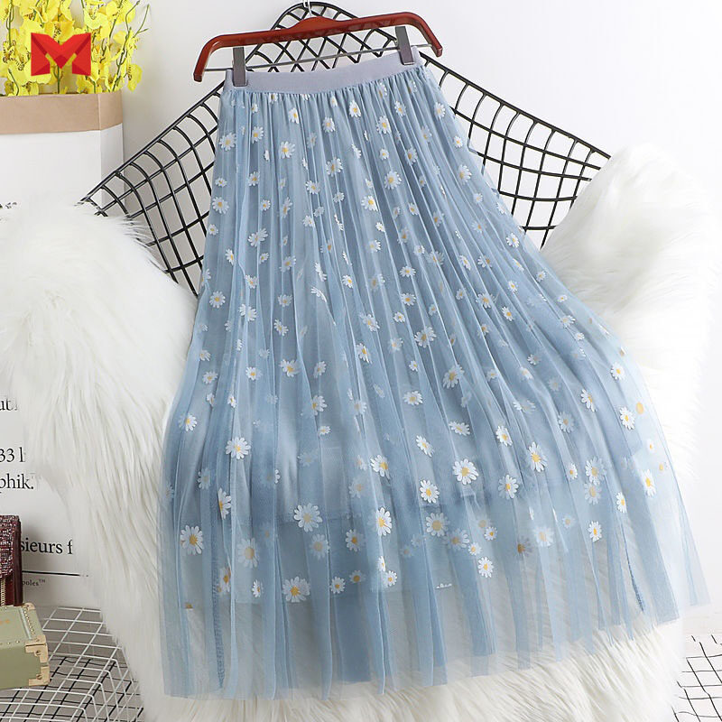 Hot Sale Women Long Skirts High Waist 3 Layers Mesh Gauze Skirt Girl Pleated Print Sweet A- Line Skirt