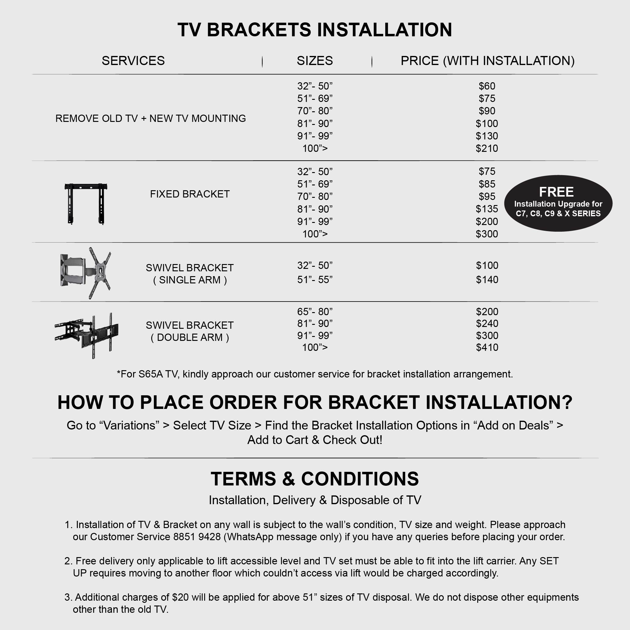 ? Delivery of TV to customer’s ship to address. The delivery does not include any form of set-up, installation and/ or bracket.