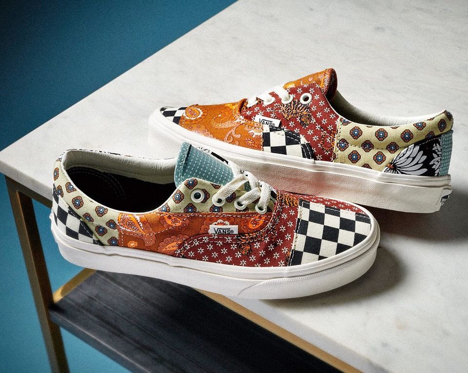 Vans designers uses patchwork application to express exciting geometric patterns and visual motifs. The Tiger Patchwork pack remasters the Era by incorporating an innovative variety of colour, pattern and mixed materialisation.