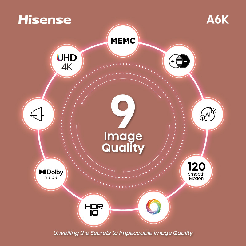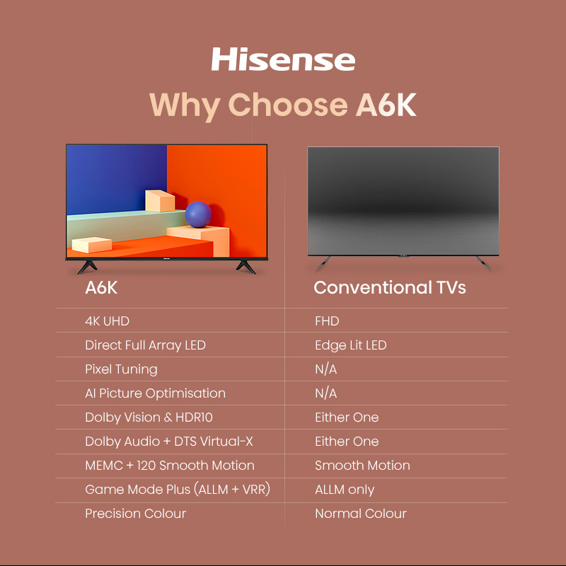 Hisense A6K Smart TV 55 inch | UHD | Direct Full Array | AI Adaptive Depth | Dolby Vision | Dolby Audio | VRR + ALLM | Pixel Tuning | AI Picture Optimisation | MEMC | 120 Smooth Motion | Precision Col