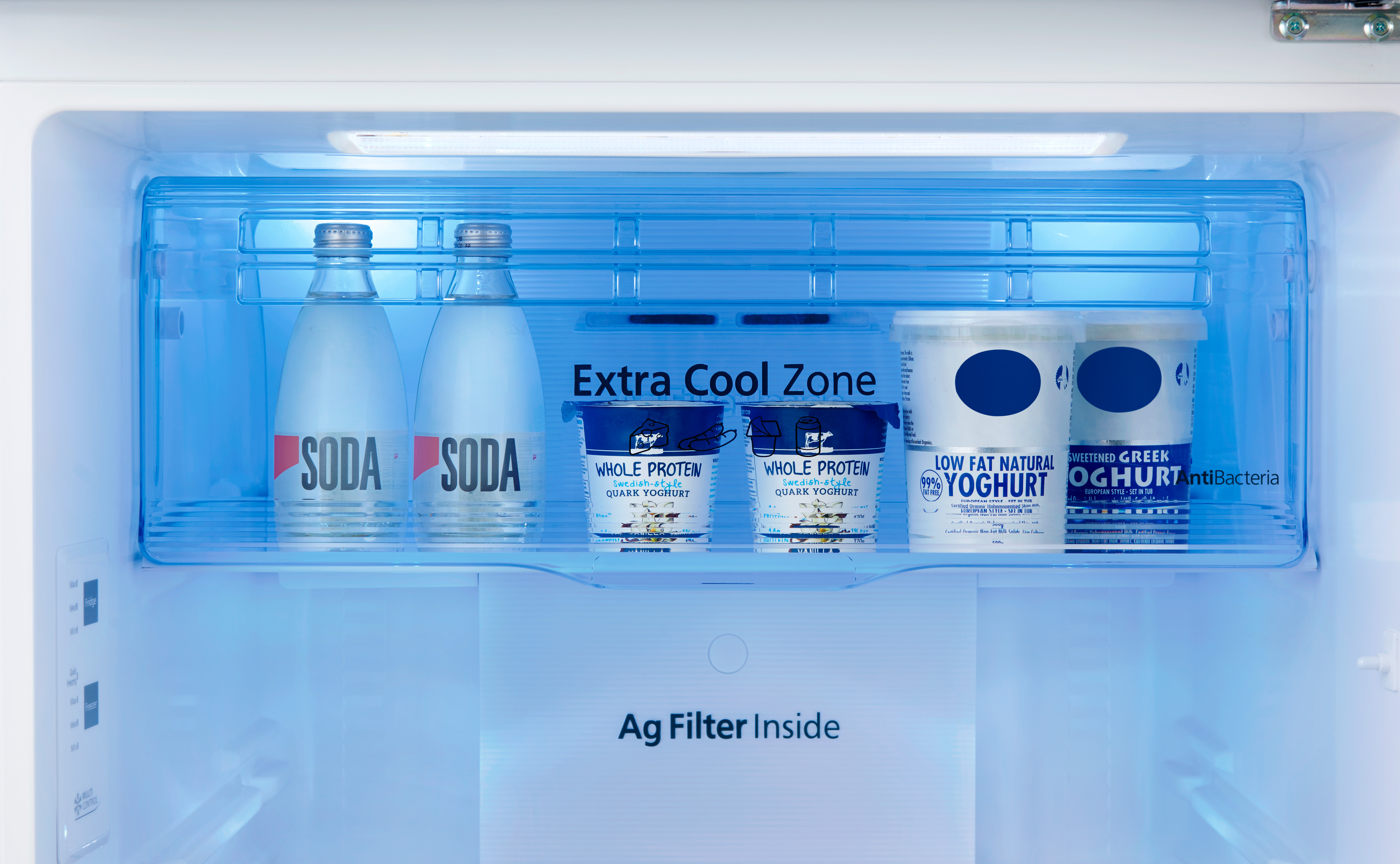 The Extra Cool Zone is ideal for cooling drinks or food quickly. The antibacterial cover cools items at approx. 2°C, slightly colder than the regular fridge compartment at approx. 4°C