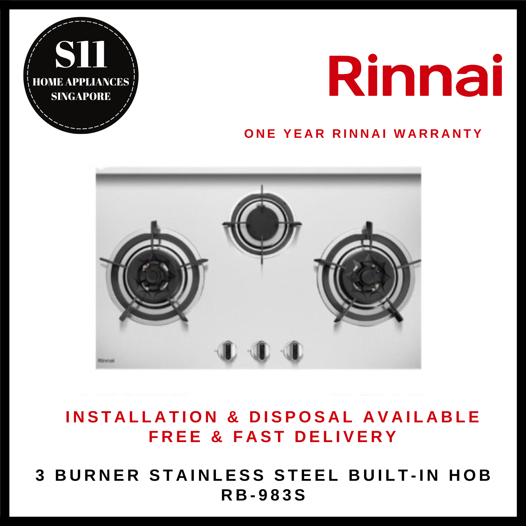 RINNAI RB-983S 3 BURNER STAINLESS STEEL BUILT-IN HOB - READY STOCKS & DELIVER IN 3 DAYS