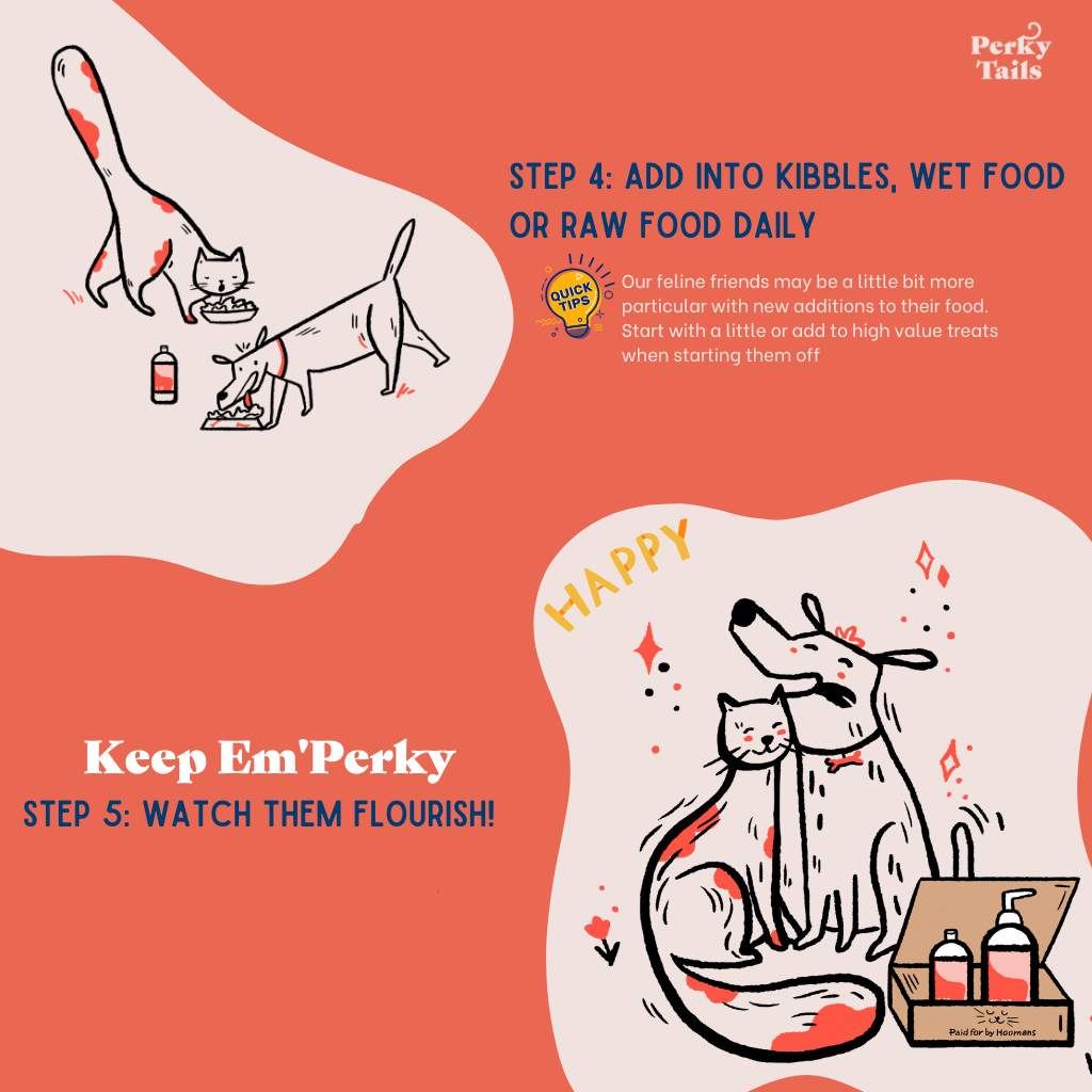 Perkytails Pure Wild Alaskan Salmon Oil for Dogs and Cats is a premium omega-3 fish oil that is great for skin and coat, joint, brain health and overall immunity!