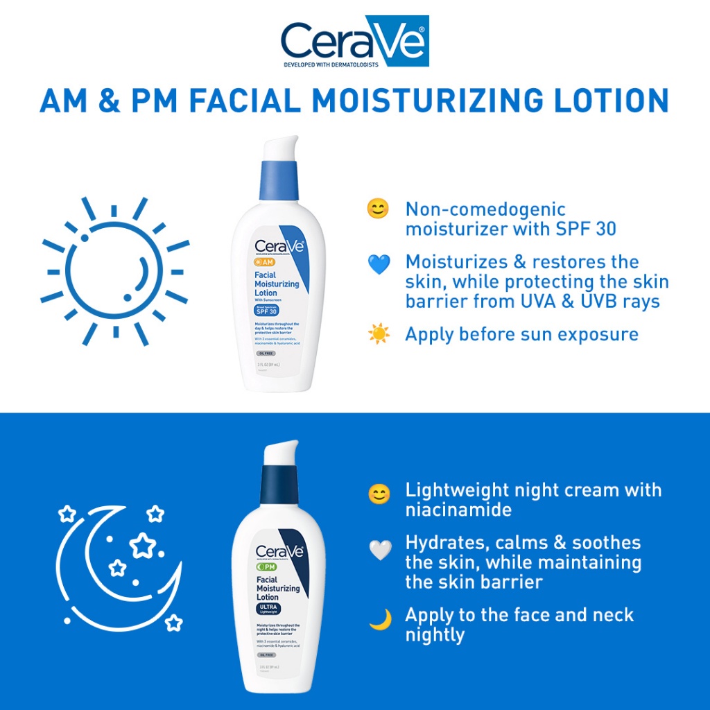 CeraVe AM Facial Moisturizing Lotion & PM Facial Moisturizing Lotion AM Facial Moisturizing Lotion: Elevate your morning routine with CeraVe AM Facial Moisturizing Lotion. This dermatologist-developed formula combines hydration and sun defense with broad-spectrum SPF 30 protection. Patented MVE Delivery Technology ensures a steady release of ceramides throughout the day, fortifying your skin's natural barrier for lasting moisture. Key Features: Hydration and Sun Defense: Seamlessly integrate hydration and broad-spectrum SPF 30 protection. Ceramide Technology: MVE Delivery Technology provides a continuous supply of nourishing ceramides. Broad-Spectrum SPF 30: Guard against UVA and UVB rays, preventing sunburn and premature aging. Gentle on the Skin: Non-comedogenic and fragrance-free, suitable for various skin types. Usage Instructions: Cleanse: Start with a thorough cleanse for optimal absorption. Apply: Gently apply to face and neck, ensuring even coverage. Reapply: Maintain sun protection by reapplying every two hours or more frequently if needed. Layering: Easily incorporate into your routine, applying before makeup for a smooth base. Precautions and Recommendations: Sunscreen Daily: Use daily, even on cloudy days, to protect against cumulative sun exposure. Avoid Eye Area: When applying, steer clear of the delicate eye area. Patch Test: Perform a patch test, especially for sensitive skin. Layering with Other Products: Compatible with other CeraVe skincare products. Layer over serums and under makeup. PM Facial Moisturizing Lotion: Complete your evening routine with CeraVe PM Facial Moisturizing Lotion. This dermatologist-developed formula focuses on hydration and skin renewal, featuring essential ceramides to strengthen the skin barrier while you sleep. Key Features: Nighttime Hydration: Provide overnight moisture for a rejuvenated complexion. Ceramide Technology: MVE Delivery Technology ensures sustained ceramide release throughout the night. Non-Greasy Formula: Lightweight and non-greasy, ensuring comfortable overnight wear. Gentle on the Skin: Non-comedogenic and fragrance-free, suitable for various skin types. Usage Instructions: Cleanse: Start with a gentle cleanse to prepare your skin. Apply: Gently apply to face and neck before bedtime. Precautions and Recommendations: Nightly Renewal: Incorporate into your nightly routine for optimal hydration and skin renewal. Avoid Eye Area: When applying, avoid contact with the delicate eye area. Patch Test: Perform a patch test before full application to ensure compatibility. Elevate your skincare with ceramides, whether facing the day or settling in for the night. Trust CeraVe for lasting hydration and skin defense.