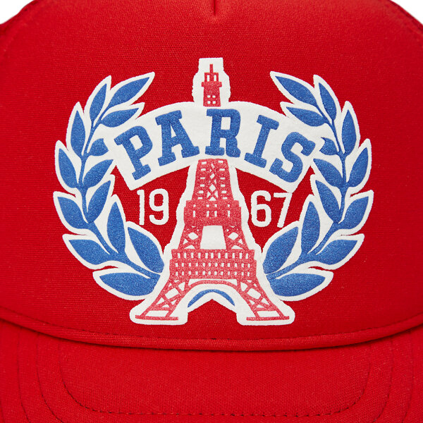 This foam trucker cap features a flocked "Paris" graphic at the front and an embroidered stripe at the bill.