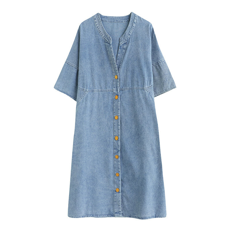 Summer New Arrival Dress Plus Size Ladies Stylish Drawstring Denim Shirt Artsy Outwear Plus Size Short Sleeve Cardigan A- line Skirt
