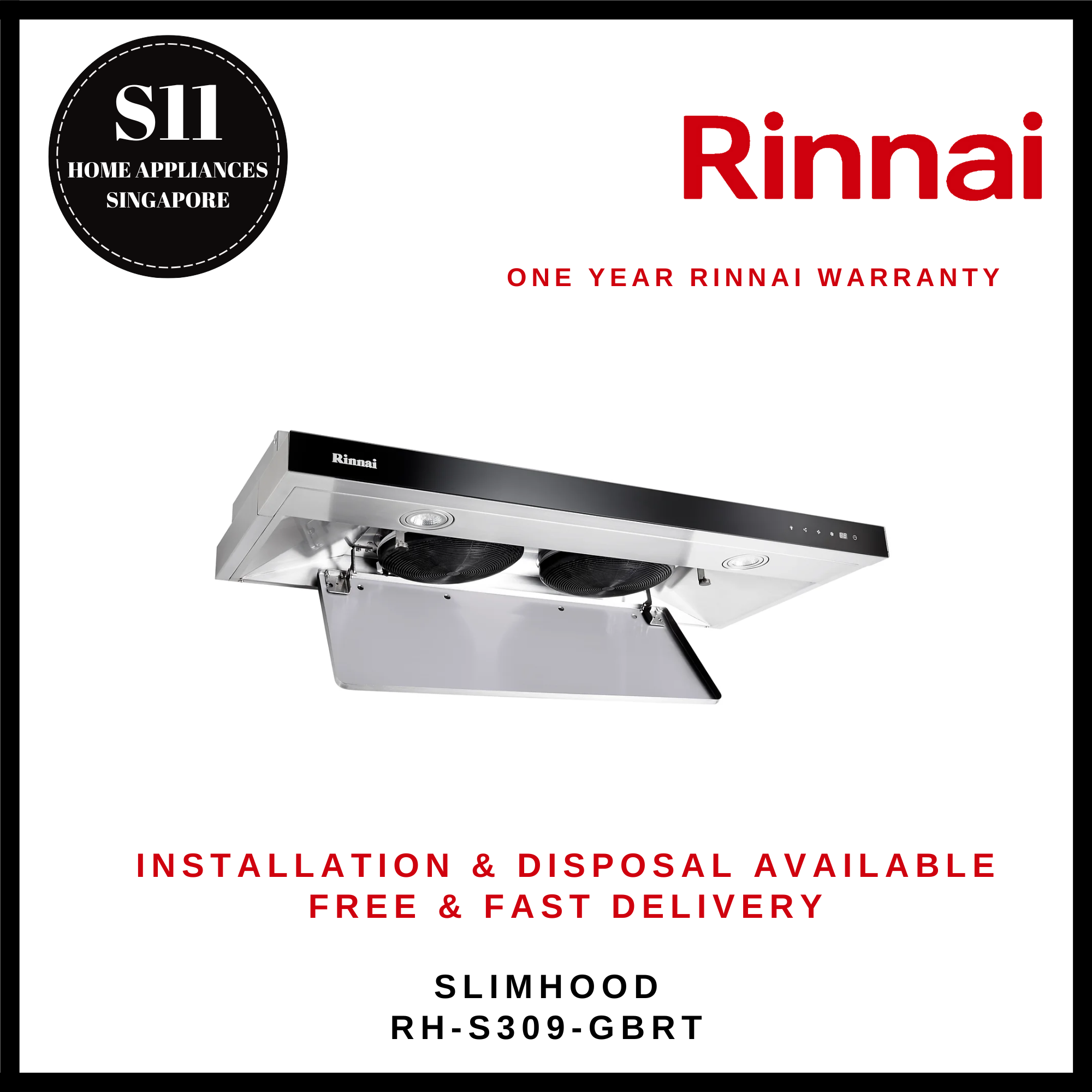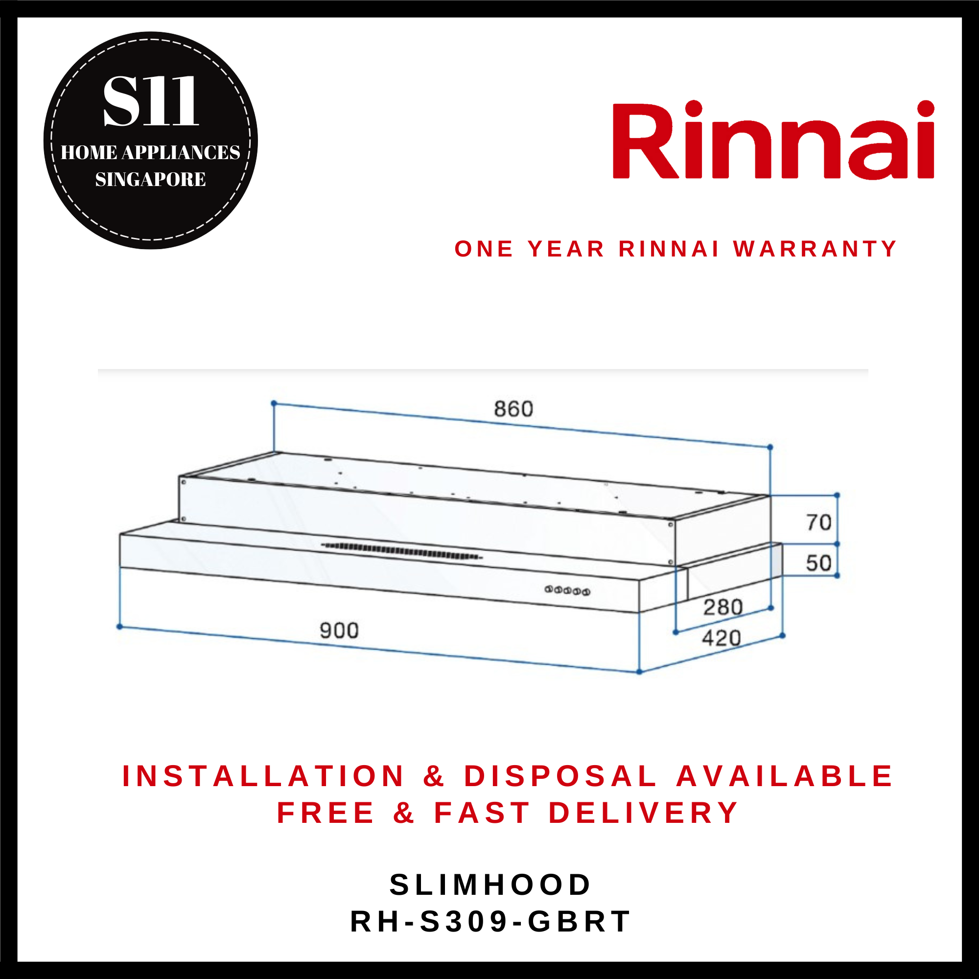 RINNAI SLIMLINE HOOD RH-S309-GBRT - *READY STOCKS*