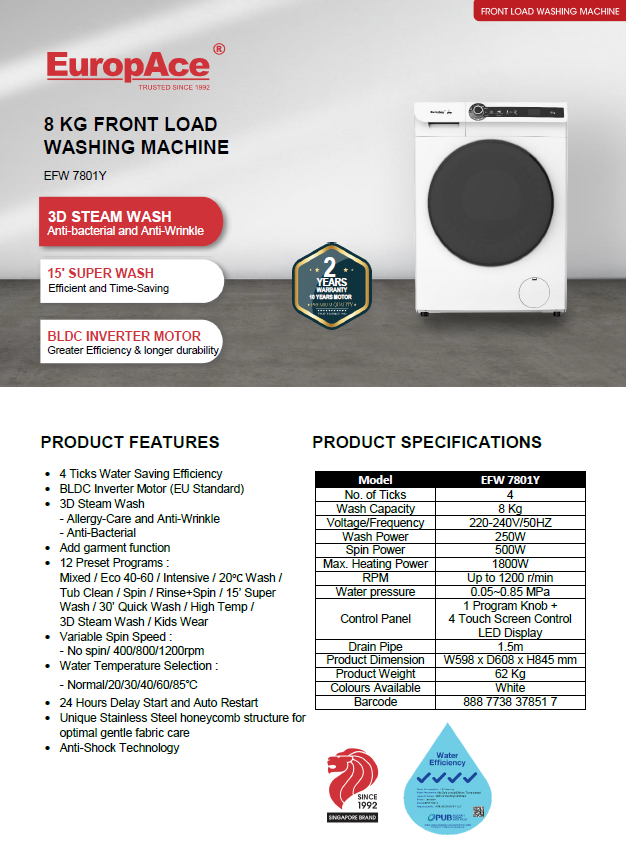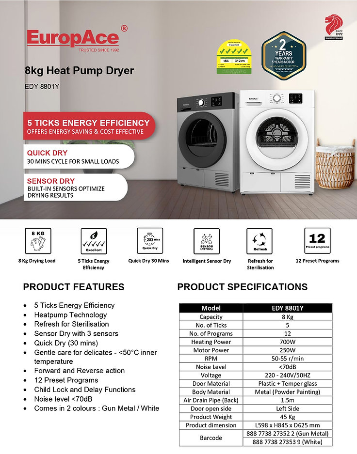 EUROPACE EFW 7801Y 8KG WHITE INVERTER FRONT LOAD WASHING MACHINE + EUROPACE EDY 8801Y 8KG WHITE FRONT LOAD HEAT PUMP DRYER