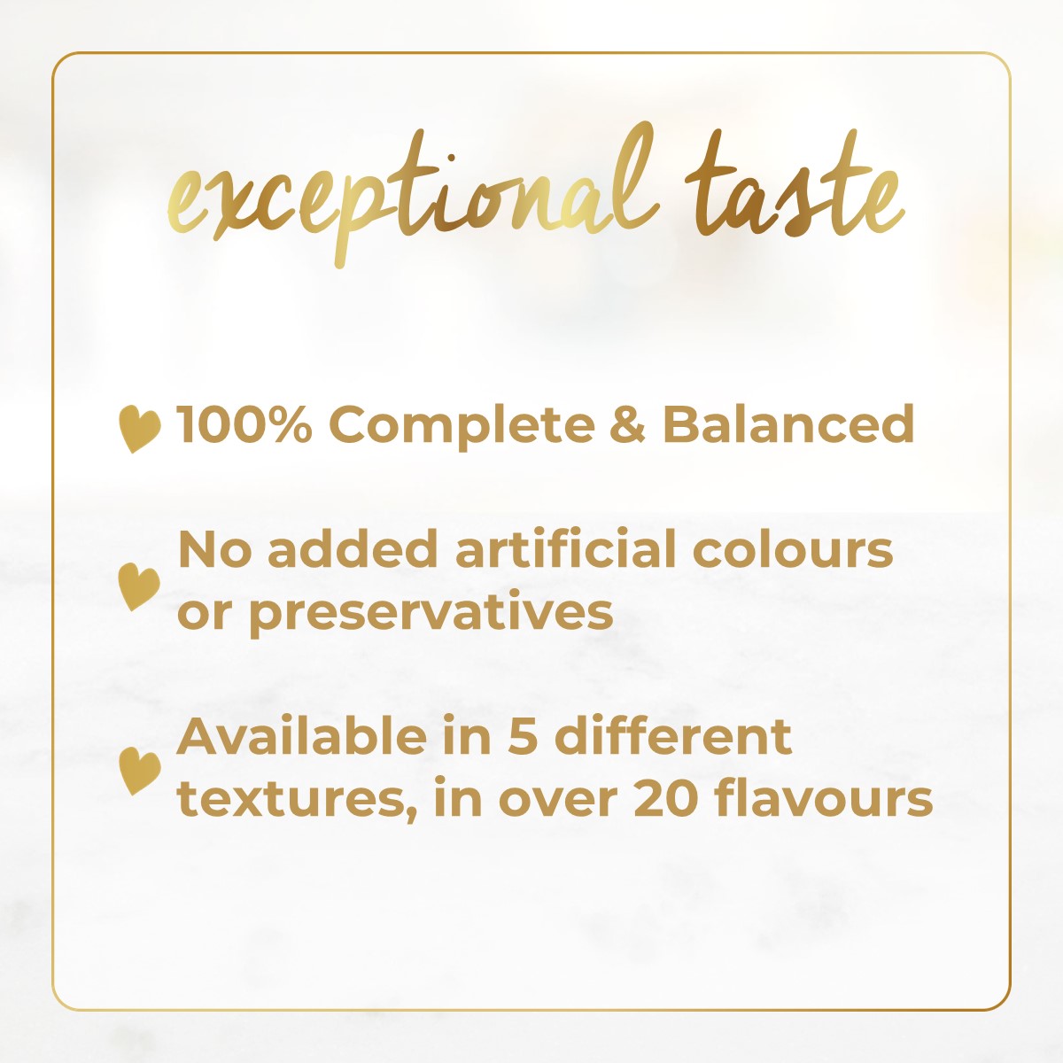 100% complete & balanced nutrition crafted with real ingredients & different texture for your cat's selection! Prepared with a high standard of taste, nutrition, quality and love for an experience that will excite your cat any time, every day.