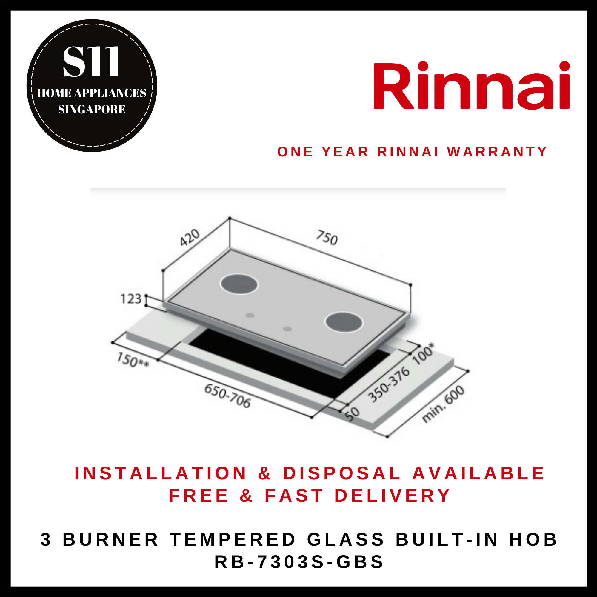 RINNAI RB-7303S-GBSM 3 BURNER TEMPERED GLASS BUILT-IN GAS HOB - READY STOCKS & DELIVER IN 3 DAYS