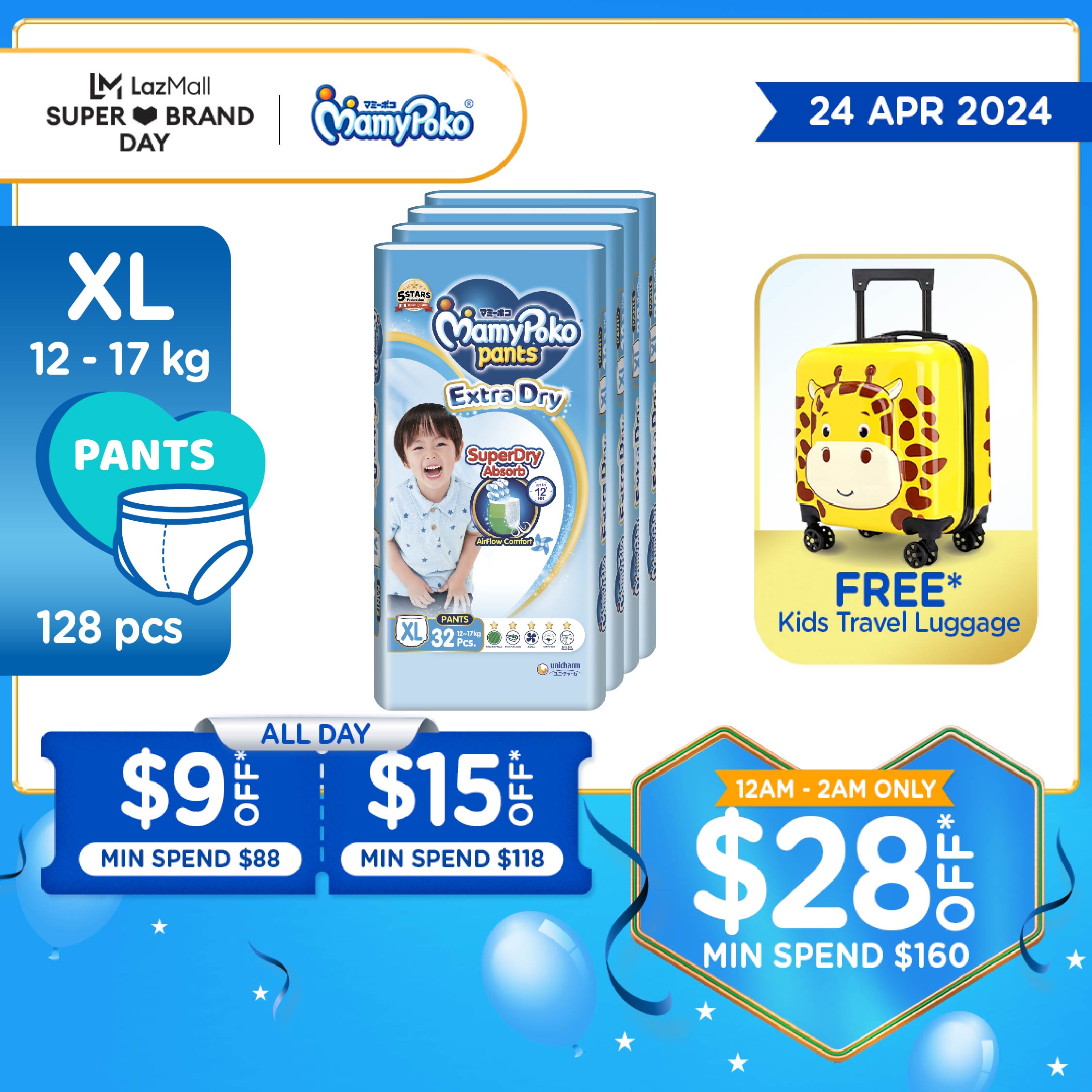 MamyPoko Extra Dry Pants Baby Diapers XL 32pcs x 4 Packs (12-17kg) [Carton]