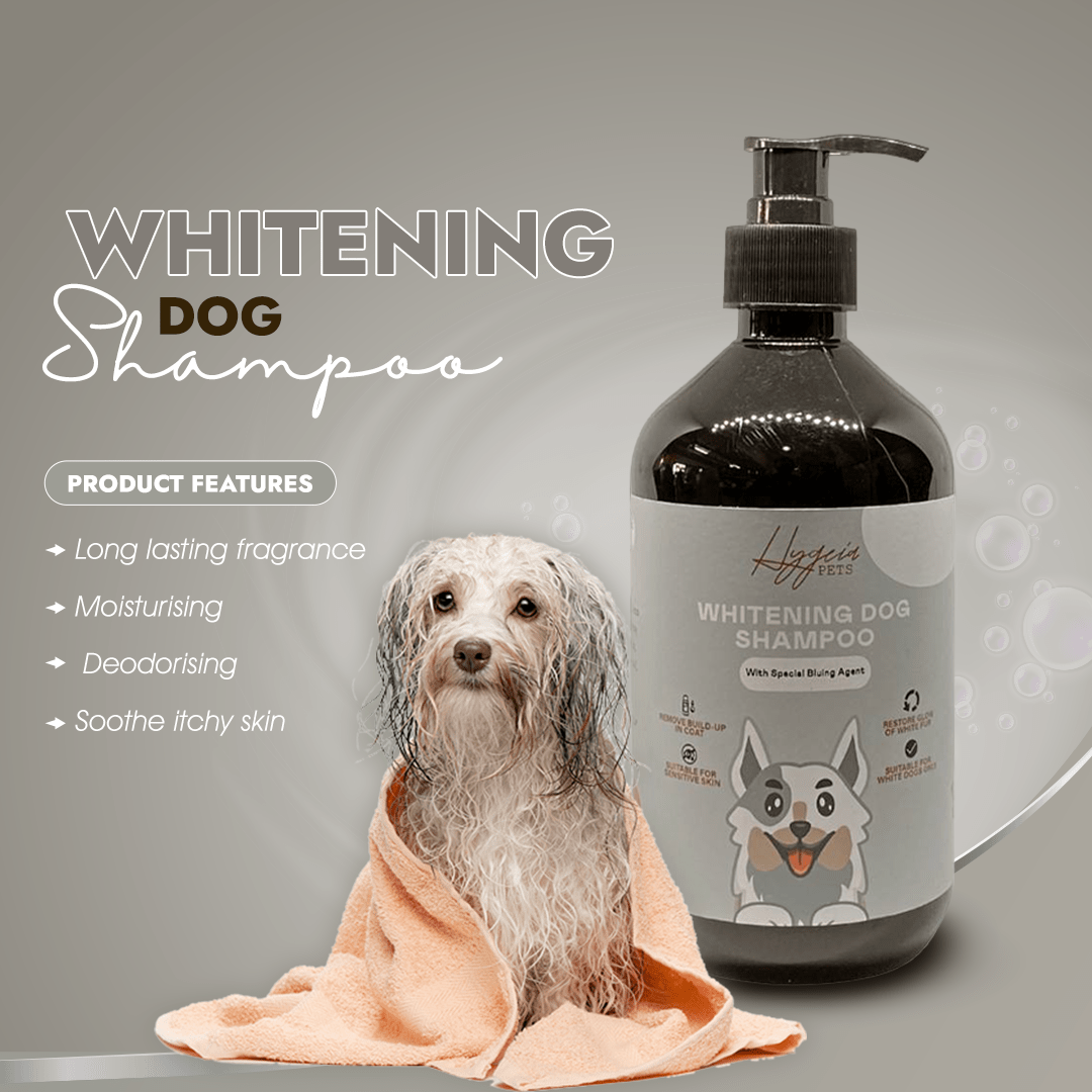 Whitening Dog Shampoo is specially formulated to be tear-free as it does not contain any SLES. The blue dye used is pet friendly and food grade. It color corrects yellowish fur to look whiter and brighter to restore the glow of the fur. It deep cleanses the fur to remove any build up in the dog coat, leaving fur refreshed and clean.