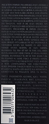 Giorgio Armani Fragrance Alcohol, Water, Fragrance, BHT, Linalool, Geraniol, Alpha-Isomethyl Ionone, Coumarin, Limonene, Hydroxyisohexyl 3-Cyclohexene Carboxaldehyde, Hydroxycitronellal, Citronellal, Citornellol, Citral, Butylphenyl Methylpropional, Hexyl Cinnamal Precautions: Do not use near fire, flame or heat. Avoid spraying into eyes #43,799 in Beauty & Personal Care ( ) #247 in