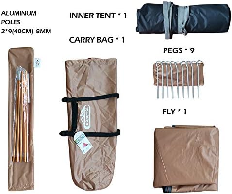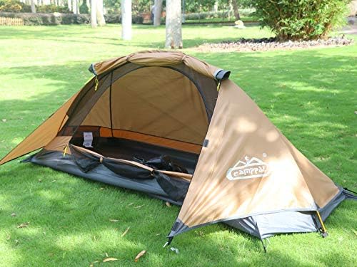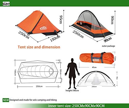 3500~4000mm Fabric Imported [Professional 1 Person Tent]: Size: Inner tent(L8.2ft x W2.95ft x H2.95ft), Outer tent: L8.2ft x W(2.95ft +1.31ft) x H3.11ft, 3500~4000mm Water Resistance. Fire Retardant Standard/CPAI-84. This 1 person camping tent is very light, just 3.75lb, easy to carry on when you camp outside, besides, it's also very easy to set up with only one single ridge pole. [Waterproof and Stable]: Outer tent with the water proofing value of 3500mm, seam taping on the zipper, velcro wrap with PVC & seam taping, 4 bottom corner with seam taping, which are high and good enough to prevent the water from entering even under the big heavy rain; Strong aluminium pole construction and the anti tearing rip-stop fabric which greatly help to prevent the hitting and tearing on fabric from the strong wind under the bad weather with big storm. [Extended Length - 8.2ft]: This single person tent is long enough to enable the taller person to sleep in the tent comfortably; The longer tent also provides with extra space for the personal belongings like luggage, backpack, clothes, shoes, etc. [3 Minute Quick Setup]: Super easy to set it up! It takes only just 3 minutes to pitch tent even for a beginner, and we have specially made the longer and bigger carry bag for the end customer even to pack up the tent loosely and still could put it back into the carry bag easily and conveniently. [No-Risk Purchase]: Camppal offer unconditional 30-day money back guarantee and limited lifetime warranty to make it an absolutely risk-free purchase. If you have any question about the tent, Pls just email us, 24/7 customer service will be offered and a satisfied solution will be provided less than 12 hrs.