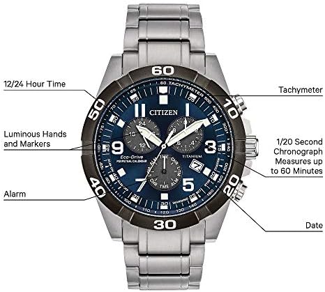 Men's luxury timepieces with technical advancements and a sporty style An Eco-Friendly Evolution: Citizen launches first Titanium Watch in 1970. More than 50-year-old evolution of innovative timepieces crafted from proprietary space-age material. Benefits of Super Titanium: Lightweight for Better Comfort, Scratch Resistant, Gentle on Skin, and Rust Resistant. Five times harder and 40% lighter than stainless steel. 1/20 Second Chronograph Measures up to 60 Minutes, Perpetual Calendar, Dual Time (Second Time Zone), 12/24 Hour Time, Alarm, Date Sustainably powered by any light, with our Eco-Drive technology this watch never needs a battery. 100 Meters Water Resistant and 5 Year Limited Warranty #321,980 in Clothing, Shoes & Jewelry ( ) #1,612 in