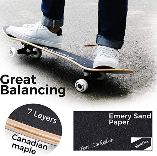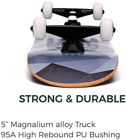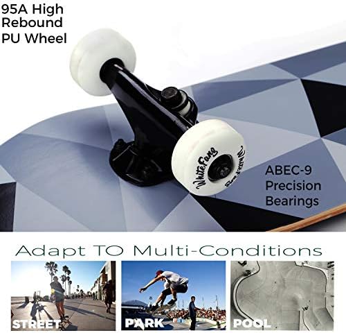 Solid&Durable : 7 layers Canadian maple deck,31.75"*7.88", offers perfect balance between toughness and weight. Maximum load weight up to 330 pounds, equipped with 5 inch magnesium alloy trucks. Reliable for beginner and skilled. Smooth&Speedy : Super smooth (52mm,95A)High rebound PU wheels with ABEC-9 precision bearings and 95A High rebound PU bushing; Our wheel can give you quick response from the ground,suitable for commuting, skate parks, ramps, pools and other smooth surfaces or even rough ground. Master New Tricks : ️Design for beginners and skilled, double kick dissymmetric concave combines with customized emery sand paper give your feet enough locked feeling ,help you learn new tricks quickly. Graphic Design: Minimalist Black&White graphic design , printed with thermal transfer printing process allows greater print durability. The pattern lasts much longer. No Assembly Required: Come with completed 31.75"* 7.88“ profession skateboard which helps save your time and hassle of assembling. Ready to play out of the box!