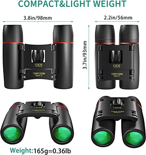 Lightweight Small Binoculars: You can throw them into your backpack each day without hesitation. The mini pocket binoculars are totally worth the tiny amount of weight they add to your pack. Compact Binoculars Clear vision: 12x25 optics binoculars with a 12X magnification and objective lens diameter of 25 mm, What's more is with the large field of view-126ft/1000 yards, you can see the entire visual field for capturing objects easily. Easy on Focus: Just adjust by Smooth "center-focus knob" and right eye lens. The folding binoculars suitable for both adults and kids binoculars. Compact Binoculars with BAK4 prism which can 100% reflect the light to keep a good image (while don't forget to adjust the knobs to fit different view distance), made of Mg body and hand figured polishing. Application: Perfect for adults, kids, concerts, theater, opera, plays, shows, travel, hiking, camping, sport events, bird watching , etc. The binoculars come with their own neck strap, cleaning cloth and carrying bag.