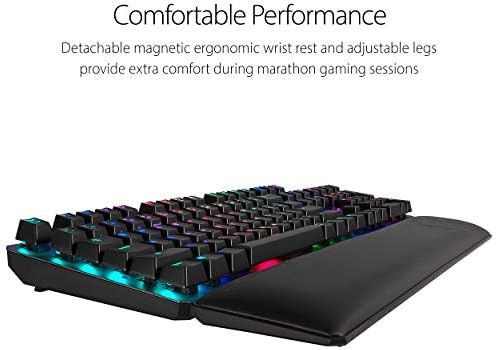 Optical mech switches deliver fast response time for light speed gaming Frameless design with aircraft grade aluminum faceplate to withstand 100 million keystrokes IP56 specialized coating and spill resistance for extended durability Asus Aura Sync RGB lighting features a nearly endless spectrum of colors with the ability to synchronize effects across an ever expanding ecosystem of AURA Sync enabled products Rog Armory II software for easy customization of buttons, profiles, and adjusting performance or lighting settings