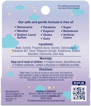 HELPS CALM, RELAX AND SOOTHE: Our instant cooling sensation works wonders on infants who may be teething, upset, cranky, or fussy DRUG-FREE: Free from benzocaine, belladonna, eugenol, sugar, menthol, sodium lauryl sulfate (SLS), sulfate, dairy, and artificial colors, dyes, and sweeteners SAFE AND GENTLE FORMULA: Our nighttime cooling gel with chamomile is easy-to-use at home or away #1 PEDIATRICIAN RECOMMENDED: Trust the professionals who trust Orajel Baby STAGE 1 FOR AGES 0+: Orajel Kids Stage 1 Teething and Tooth & Gum Cleanser products are appropriate for ages 0 and up #2,153 in Baby ( ) #10 in