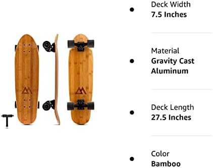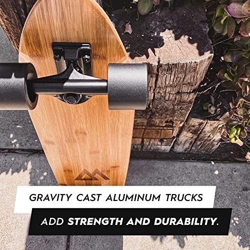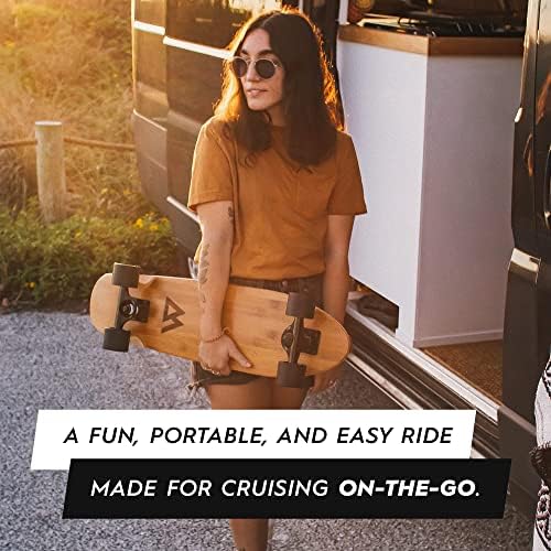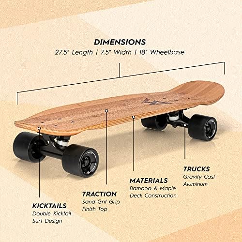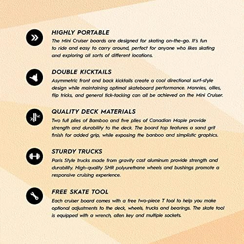 MADE BY SKATERS All of our boards are designed by skaters and inspired by our location in Southern California, the birthplace of longboarding. Many of our design cues come from the local surf culture and natural materials, we let the simple aesthetics shine on their own. We also prioritize our customer service and want you to be completely stoked with your new board. All messages are replied to within 24 hours and we’ll do our very best to ensure satisfaction and maximum cruising on our boards. SUPER PORTABLE Designed to be fun to ride and easy to carry around, this is our go-to board for anyone who skates everywhere. The small size of the board makes it easy to carry and take on the go while still being a great board for cruising and riding everywhere! Length = 27.5" | Width = 7.5" | Wheelbase = 18.5" DOUBLE KICKTAILS Double kick tails add fun and versatility to the mini cruiser skateboard. Mannies, ollies, flip tricks and general tick-tacking are all made possible because of these kick tails. Asymmetric front and back kick tails makes for a cool directional surf style design while maintaining the performance of a great skateboard. HIGH QUALITY DECK Manufactured from 6 full plies of Canadian Maple, the deck is very strong and durable. The board sports a sand grit finish on top to grip your feet and show off the maple deck and the unique graphics. STURDY TRUCKS The trucks are made from quality gravity cast aluminum making them super reliable and sturdy. The top mounted trucks have a 5 inch hanger and kingpin angle of 55 degrees and the wheels and bushings are cast in high quality SHR polyurethane...no plastic parts on this board!