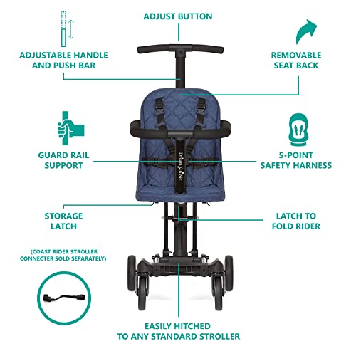 Polyester Imported EXPERIENCE THE WORLD: The Parent-approved Coast Rider Stroller effortlessly converts from Stroller to Scooter & Rider, offering your child a 275-degree viewing! Meeting all Disney & theme park size specs with plush seating, make this award-winner a part of all family outings. BYE-BYE BULK: Super lightweight at just 13.5 Lbs, its aluminium frame & soft-ride wheels makes manoeuvrability a breeze. Combined with the easy one-hand fold feature that allows it to fold inward like a book in an instant, it’s a parent-loved choice. PARENT-CONCIOUS: The innovation-driven Coast Rider Stroller comes with adjustable handles & push bars, and water-proof fabric. It can also be combined with the Coast Rider Stroller Canopy & Connector (both sold separately) for on-the-go fun time. Available in 5 finishes. THE SAFEST CHOICE: This stroller comes a 5-point safety harness, & meets/exceeds all CPSC & ASTM standards. Winner of the 2020 JPMA Innovation Awards, 2020 National Parenting Product Awards & 2020 Baby Maternity Magazine Product of the Year Award. WARNINGS: Weight limit: 45 Lbs. Dimensions: 28” L x 14” W x 37.5” H. Additional weight on handles could tip the stroller or the child can get entangled by a strap causing suffocation or injury. Please follow all safety protocols.