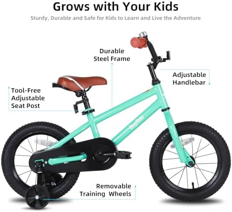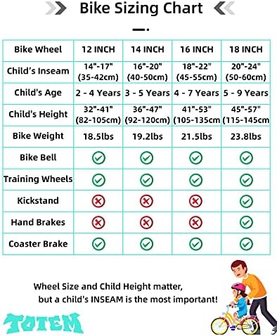 DESIGN FOR KIDS - 1. This Kids bike comes with stable training wheel early rider. 2.Quick release seat simplify the height adjustment. 3.Saddle with holder to learn riding when the training wheel is off. 4.Foot brake suitable for young rider don't have enough power to manipulate the hand brake. MINIMUM MAINTENANCE - Made of premium steel to survive the bumps of learning, the durable steel frame is backed by our limited lifetime warranty. The bike comes with black tire & single speed, only little maintenance needed due to the simple design. DIY DECAL & SAFE CHAIN GURAD - Your child will get a DIY decal, they could make a unique bike with the decal by sticking their name on the frame or chain guard. The chain guard well protects the chain, it will last longer than other bikes, your child will not get hurt when try to touch the chain. EASY TO INSTALL - The children bike comes with 85% Pre-assembled body and the basic assembly tools, only pump needed for tire, normally takes a novice about 20 minutes to assemble it. If you have problem about assembly or the bike, please contact us. RECOMMENDED SIZE CHART - 12" BIKE FOR 2-4 YEARS (33"-41") TODDLER, 14" bike for 3-5 years (35" - 47") child, 16" bike for 4-7 years (41" - 53") boys & girls, 18" bike for 5-9 years (43"-59") boys & girls. Note: child height may vary even at the same age, please take the height into consideration.