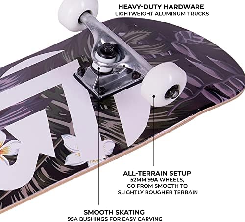 DURABLE DECK — A medium concave 8-inch deck made with high-quality Maple wood. READY-TO-RIDE — Includes 52mm 99A wheels and pre-applied griptape. HEAVY-DUTY HARDWARE — Lightweight aluminum trucks and ABEC-7 stainless steel bearings. SMOOTH SKATING — 95A bushings prevent wheel bite and provide easy carving. 1-YEAR WARRANTY— Covers against manufacturer defects for up to a year.