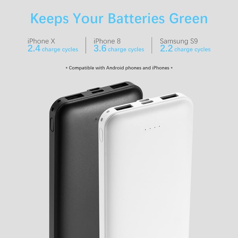 【2023 Upgraded USB-C Output】Two 10000mAh battery packs not only for portable charging but also around the home. Allowing you to charge mobile devices without having to be tethered to a plug socket. Now USB-C charging is available, makes it easier to charge an iPhone or Android phones with USB-C cord. (Lightning cord is not included) 【Dual Output & Input】Each also has 2 USB output ports that detect all the connected devices and efficiently distributes the current output up to 5V 2.4A. The USB C and Micro USB ports can fully refill the battery itself in 5 hrs at 5V 2.0A. 【Small & Slim】It feels incredibly compact for a 10000mAh power bank, weighing just 218g and only 14mm thick. Grippy design is easy to hold, easy to toss into a bag and incredibly portable. 【Reliable Li-polymer Cell】Thanks to the Li-polymer battery pack, the charger is much safer than any Li-ion charger. Also, it's lighter and slimer that you can easily carry it around, even on airplanes. 【What You Get】2 * Miady 10000mAh USB Portable Charger (White & Black); 2 * USB Cable (Lightning cord is not included); 1 * User Manual. We provide 24*7 friendly customer support and also back our products for 18 months.