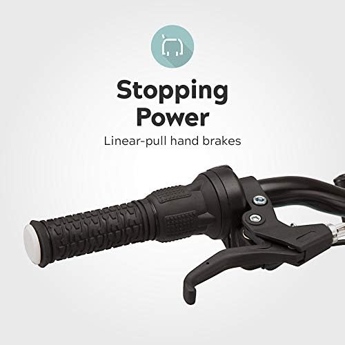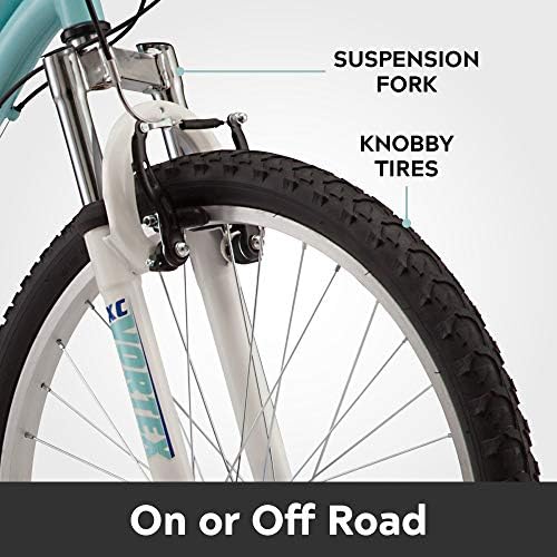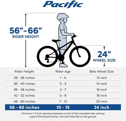 Durable 15 inch steel mountain frame and front suspension fork to take on bumps and drops with ease, 24-inch wheels, Riders Ages 8+, Suggested height 4’8” to 5’6” 18-speed twist shifters and rear derailleur guarantee consistent and seamless shifting Front and rear V-brakes deliver controlled and responsive stopping for added safety 3-piece mountain crank provides a wide gear range for versatile riding Benefit from the durability and strength of alloy rims, coupled with the on-trail traction provided by wide mountain tires
