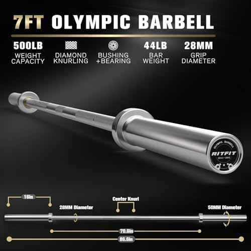 RitFit 7ft Olympic Bar with bearing weights 20 kg (~44 pounds), has a bar shaft diameter of 28 mm, and a length of 2.2 meters (7.2 feet). Needle bearings allow for a smoother, quieter spin and a more reliable turnover at maximum loads.Weight Capacity: 500lbs. 【Build to Last】 Built to the highest standard using high-quality steel materials, barbells feature an oxide finish and are built to be durable for a lifetime of quality weight lifting. 【The Best Choice for You and Your Home Gym】 The hybrid bars are intended to be used as a general-purpose bar that is suitable for the Olympic lifts but can also handle the slower, heavier power lifts, perfect for most athletes, and ideal in home gym and garage gym settings.The Volcano knurling type on the grip provides enough friction to grip. All the 2 inch weight plates are suitable for thr bar. 【6 Different Options】. RitFit Olympic Bars provide 4ft/5ft/6ft/7ft length to choose from. Whether you’re a newbie, intermediate, or elite athlete, you can find a bar good for you.We provide rackable barbells for most weightlifting exercises, also provide unrackable barbells for lightweight workouts. 【Warranty】RitFit Weight Bar is rugged and durable enough to come with a LIFETIME WARRANTY against Bending.