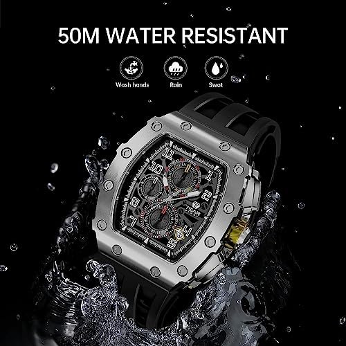 TSAR BOMBA Tonneau Mens Luxury Watch 50M Waterproof Luminous Date Chronograph Wrist Watch with Japanese Quartz Movement Sapphire Crystal Silicone Strap Fashion Sport Watches Gift for Men