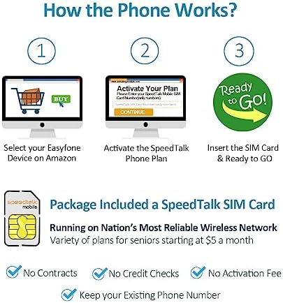 Clear and loud sound; Easy-to-Use operating system. Classic bar-type cell phone focus on calling and texting, No Internet access and without camera. 1050mAh real capacity battery with an easy charging dock, Long time standby and easy to charge. Additional SOS button; Eight Speed dial buttons (8 number keys can be set as dedicated direct dial keys). Multi useful functions: FM Radio, Alarm clock, MP3 Player, Notes, Calculator, Calendar, Bluetooth, Flashlight, SOS feature and Speed dial. Unlocked to T-Mobile, MetroPCS, SpeedTalk and Tello Mobile, This phone work great with SpeedTalk (SIM Card Included) which running on T-Mobile network, Variety of plans starting at $5 a month, Option for Keep your existing phone number or Get a New phone number. Please note that this phone is NOT compatible with AT&T, Cricket or with CDMA Networks like Verizon, Sprint, and Boost Mobile.
