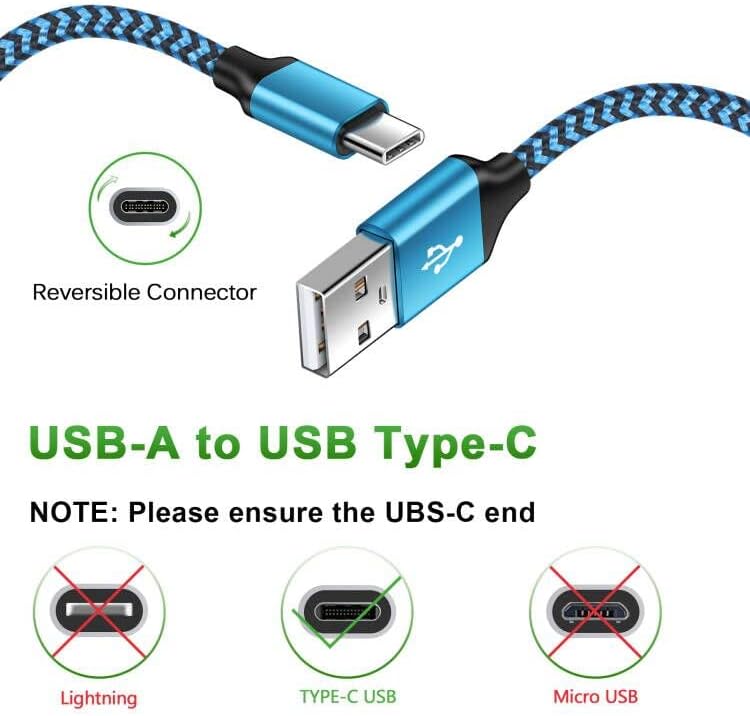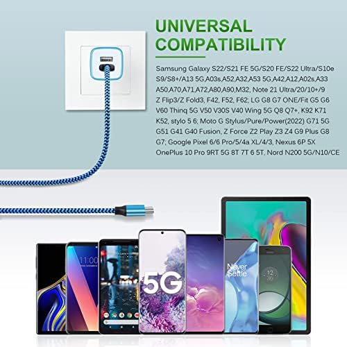 【Broad Compatibility】USB Type C Cable Fast Charging for Samsung Galaxy A15 5G,A14,A13,A54,S23 Ultra,S23+,A03s,A53,A23,A25,A24,S22,S21 FE/Ultra,S20 FE,S10e,S9,Z Fold 5 4 3,Z Flip 5 4,A12,A32,A52,A02s,A42,A52,A10e,A73,M52,M42,M32,Note20 Ultra/10/9;iPhone 15/15 Pro Max/15 Plus;Google Pixel 8,8 Pro,7a,7,7 Pro,6,6a,5,4a XL,4,3 XL,2;Moto Edge 5G UW,Edge Plus,Edge 20 Lite/20Pro,G100,G30,G10,G Play/Power/Stylus(2022),Z/Z2 Force/Z3/Z4;OnePlus Nord N200/N10/CE/10Pro/9/8T/7/6/5T and other type c device. 【3A Fast Charge & Sync】Android Charger Cable supports safe high-speed charging at 3A and data transfer speed up to 480Mb/s, 30% faster compared with other cables. Data Transfer and Power Charging 2 in 1. 56kO resistor provide outstandingly reliable conductivity & stability, protect your devices and charging adapters from damage. To achieve fast charging, you will need a usb wall charger rated for fast charging and a phone capable of the same. 【USB A to C Type C Charger Cord Enhanced Durability】Special Strain Relief Support design can bear 12000+ bending test, protect the most vulnerable joint of galaxy s22 charger type c usb cable. Premium aluminum housing and sturdy nylon fiber cover adds premium durability to the cable. Cables are tangle free & durable enough to withstand everyday heavy usage, but still in great performance. 【Special Design of USB C Cord】Nylon braided technology reinforces cord's durability, not easy to break and crack. 3ft USB C charging cable provides an extension for use, perfect for travel, home and office. Perfect 3ft long cord is enough for you to use without being restricted by the power socket location. The samsung c type charging cable support from both sides, can be inserted "positive and negative insert" function. 【What You Get 】3-Pack 3ft Nylon Braided USB 2.0 Type C Fast Charging Cable(White,Blue,Purple). 12-month worry-free warranty. If you have any concerns about our samsung android cell phone c charger cable, please feel free to contact us by email, we promise to help you resolve the issues ASAP.
