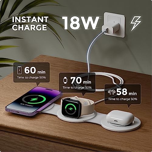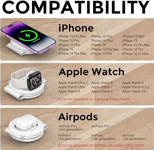 【3 in 1 Wireless Charger 】: The 3 in 1 Wireless Charging Station for Apple Devices is a great option to organize your home, office, or meeting room. It lets you say goodbye to tangled cords and messy cables, keeping your space neat and organized, making it a convenient charging solution for your busy lifestyle.(Quick charger Included) 【Fast Wireless Charging Station】: This wireless charging station is specifically designed to be compatible for iPhone Airpods Apple Watch. With an 18W quick charger, you can fully charge your device in just 2-3 hours. 3 in one charger for Apple Watch/iWatch/Airpods/iPhone 15 14,13,13Pro,13Pro Max,12,12 Pro,12Pro Max,12 Mini 【Wireless Cell Phone Charger with Strong Magnetic Snap】: For Apple wireless charging station features high-quality magnets that ensure effortless alignment of your smartphone's wireless charging coil, resulting in a fast and stable charging experience. 【Travel Essentials: Portable&Foldable Travel Charger】: This foldable travel charger stand is a great addition to your travel gear, lightweight and portable, easy to pack in a bag or suitcase, providing a stable charging experience during your travels or business trips. It also doubles as a phone stand, allowing you to adjust it horizontally or vertically for easy movie-watching or FaceTime calls. 【Exclusively Design for Wirelss iPhone Charger 18W】: This charging pad has a higher height design to prevent damage to your camera and ensures stable charging without any interruptions caused by gaps between the phone and charger. You can trust the safety and reliability of this wireless charger. It makes for a great gift choice for both men and women.