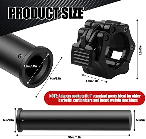 ??FITS OLYMPIC WEIGHT PLATES: A Pair of Olympic 11.8" Adapter Sleeve, Converts 1" Standard Weight Plate Posts to 2" Olympic weight bar or weight post. Great for older style barbells, curl bars, and plate-loaded weight machines. ??WIDE APPLICATION: The outer diameter of this adapter is designed to be exactly 50mm, which matches any 2" Olympic weight board and barbell collar. ??INCLUDING 2PCS BARBELL COLLARS: Providing you with two 2" Olympic barbell clamps, the high quality rubber pads maximize barbell clips grip to ensure your weight plates don't slide or move during your workout or when used on a weight plate rack. ??The Olympic adaptor sleeve features a hexagonal bolt locking feature with metal nuts and hexagonal screws pre-built in so that the slip cord will not be stripped, giving you long-lasting performance and security for your weight storage stakes. Includes hex key. ??HIGH QUALITY MATERIAL: Made of heavy duty and high quality nylon ,End cap is Removable for use with longer 1" standard posts! Includes 2 Allen keys to tighten and loosen the metal hex nut. However, please still refrain from overtightening.