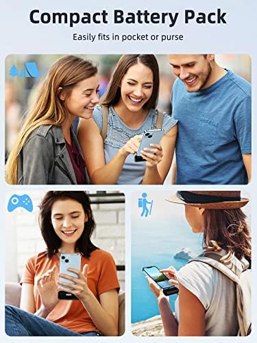 【5000mAh LCD Display Charger】 The portable power bank has LCD displays the battery numerically, let you know when need to recharge it before running out of battery. 5000mAh portable charger is officially MFi certified, lightweight with big capacity which allows at least fully charge once when charging without using the phone, charging starts just by plugging in, an ideal charging companion for travel and outdoor activities. 【Adjustable 4 Modes LED Light】 The portable battery charger has LED lantern that can be switched to 3 colors of warm - white - warm white, you can use it as fill light for selfies and flashlight in the dark. In additional the SOS flashing mode is designed for emergency, you can clearly send out a distress signal to get rescue in the case of distress. 【For All iPhone and AirPods】Portable Charger has an integrated connector and battery, can charge all your devices with this one battery pack charger, it's about the size of a car key weighs 92g, you can charge while gaming or calling. Widely compatible with iPhone 14 14 Pro Max 13 13 Pro Max 12 12 Mini 12 Pro Max 11Pro XS XR X 8 7 6 Plus Airpods and so on. 【Fast Recharging Function】Recharging the cell phone charger for 50% power within 30 mins with provided USB C cable and adapter(not included), which can charge your iPhone 13 from 20% to 60% without using the phone. It's equipped with the latest heat insulation chip to prevent overheating, moreover, it supports pass-through charging which allows you to charge the smartphone while charging the charger itself. 【Customer Satisfaction】We have a professional after-sales team, if you have any questions, please feel free to contact us. The Taegila thinner and smaller charger adds convenience to charging on the way, toss it into your bag which will ensure reliable charging for your iPhone wherever you are: home, travel, hiking, fishing, on the plane, etc. What you will get: 1*portable charger, 1*USB-C charge cable, 1*user manual.