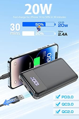 Ultra-Fast Charging - Up to 20W amazing charging speed is twice as fast as ordinary portable chargers, only 30 minutes charge 50% for iPhone 14 to away from long waiting time. Supporting PD3.0/QC2.0/QC3.0/AFC/FCP protocol to provide tailored for different electronic devices. LED Digital Display - Power levels can be monitored at any time by pressing a separate button on the side. Minimalist and elegant LED digital large screen display the battery power even accurately to 1%. Dual Port Design - Equips with a USB-C input/output port and a USB-A output port to juice up your 2 devices simultaneously or goes to share 20000mAh power with best friends/families. The dual port design is compatible with most electronic devices on the market like various cell phones, headphones, tablets, etc. (The Micro USB Port is only for charging the power bank) Cozy Touch - Each premium material has been carefully selected. The unique frosted surface integrates with exquisite grain not only anti-scratch but also brings you a cozy touch and lets you enjoy the feeling to hold it. Perfect Carry Size - As one of the slimmest and lightest 20,000mAh rechargeable batteries pack, its size is only 139*67*16.5mm and weighs 235g, even smaller than the average smartphone. Easily put it into your pocket, bag, or luggage, and keep your electronic devices alive anytime and anywhere! Powerful Protection - Built-in smart circuitry with a multi-protect safety system to ensure protection against overheating, over surge, over short-circuit and overcharging and take care of your electronic devices. the portable power bank is allowed on the plane. Package Contents - Charging Battery Pack * 1, Micro USB Cable * 1, User Manual * 1, and friendly customer service. ( Please read the “User Manual” carefully, any problem please contact us by Amazon)