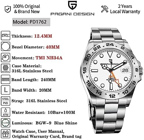 ⌚Automatic Watch movement: NH34A movement imported from Japan is of excellent quality, with a daily error of plus or minus 10 seconds. A good movement determines the value of a watch.When we wear a watch, the swing of our arms will drive the pendulum to rotate, and the winding in the watch will drive the chain of the watch, Push the time operation, and wear the rotating handle head for 20-30 turns for the first time ⌚PAGANI DESGIN 1762 SIZE:Watch thickness: 12.4mm/0.48in Strap width: 20mm/0.79in The circumference of the watch is 240mm/9.45in and the diameter is 40mm/1.58in The watch is designed for adult men. If your wrist is relatively small, we have distributed gadgets to adjust the strap. You can DIY according to your size ⌚MATERIAL and performance:The whole watch is made of stainless steel. Its glass is sapphire, and its hardness is second only to diamond. Its advantage is scratch resistance. Its net weight is 168g, which can not only reflect his sense of quality, but also won't feel bulky when worn on his hand ⌚Waterproof 100m:Its waterproof depth is 100m/10Bar It can be worn in daily life, and can also be used for swimming and diving, but it can not contact hot water and deep diving. The bottom cover is sealed and the crown is spiral, which increases its waterproof performance ⌚AFTER SALES GUARANTEE: Buy PAGANI DESIGN sports Business watches with. PAGANI DESIGN Watch 60 Day Money Back Guarantee for any Reason; 2 Years Warranty for Quality related issues. Customer satisfaction is our first priority we don’t compromise on the quality of material. Buy our waterproof wrist watch care-free. #1,107,011 in Clothing, Shoes & Jewelry ( ) #6,508 in