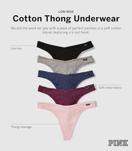 Pick a pack of perfect women's panties in a soft cotton blend, featuring a mid rise design. These thong panties have no back coverage: Designed to reduce panty lines. This mid rise thong underwear pack features an elastic waistband that moves with you. This women's underwear is made of breathable cotton that offers comfort during all day wear. Our Victoria's Secret PINK panty collection comes in a variety of prints and colors to find a style that you love. #24,563 in Clothing, Shoes & Jewelry ( ) #69 in