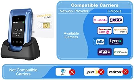 【SpeedTalk SIM】Ushining Senior cell phone come with a SpeedTalk SIM Card, minimum cost only $5 per month, option for Port-in(Keep) your existing phone number or get a new phone number. 【Built for Seniors】USHINING 4G senior flip phone, easy to use operation system, 2.4 inch screen with big menu icon, large font, high volume and high-definition loudspeakers, equipped with a charging dock, very convenient for the elderly when charge the phone. 【Practical Shortcut Keys】this senior feature phone has a SOS button on the rear cover for emergency call, preset 5 emergency contacts, allowing you immediately dialing to a preferred contact number in case of an emergency. Ideal for seniors, children or people with disabilities. 2-9 Speed dial buttons(Dedicated Direct dial keys). 【Practical Functions】blacklist, 30M powerful flashlight, external FM Radio, alarm clock, audio player, calculator, calendar, Bluetooth, dual flashlight, 6 language: English, Dutch, Spanish,Portuguese, French and Italian. 【Ultra long standby】Low power consumption design,1000mAh batteries provides 5-6 hours talk time or standby time over 100 hours (4 days). Convenient charging base, plug and charge,easy to use for the elderly. 【4G LTE network】This senior 4G basic cell phone is compatible with T-Mobile(Prepaid Plan), MetroPCS, Tello Mobile, Ultra Mobile, SpeedTalk, Simple Mobile, Mint Mobile, Red Pocket(GSMT) and any other carriers that using T-Mobile service; NOT for CDMA Carriers (Verizon, Sprint, Boost, PagePlus) or AT&T.
