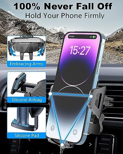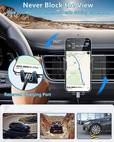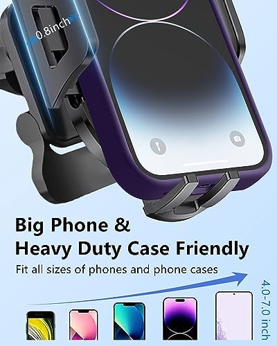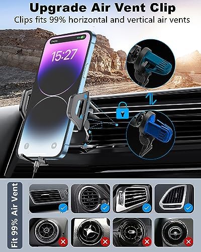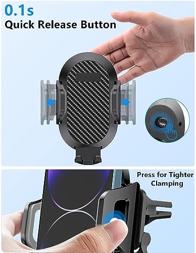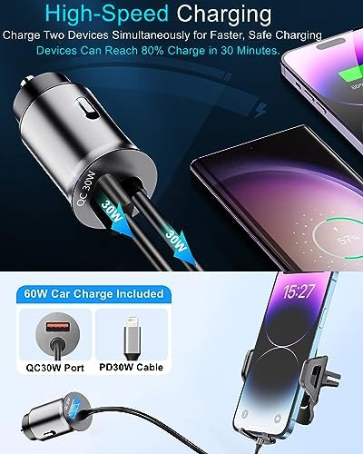 【3-in-1 Car Phone Charger Mount】: Worth having a try! C07A-L car mount charger for iphone combines car phone holder, 60W fast car charger, 4ft apple cable and vent clip in one set, which can be freely mounted on vent and fast charge your phones. The cell phone holder is suitable for most vehicles, including cars, trucks, SUVs, and taxis, making it the perfect assistant for drivers. Stay connected and hands-free while on the road with the this phone car mount. 【30W Fast Charging Cable for iPhone】: 60W USB car charger built-in 4ft Apple Cable, supports PD30W super fast charging protocol, can provide super fast charging speed for iPhone 14/13/13 Mini/13 Pro/13 Pro Max/12/12 Pro/12 Mini/iPhone SE 2020 /11 /11 Pro / X / XS/ XR / XS Max / 8 / 8 Plus; In addition, with another QC30W USB port, you can use it with your family and friends, and it will even be a great helper for your long trip. 【Easy Operation】: With the quick-release button and adjustable clamp arms, The Car phone holder makes it very easy to lock and release your phone with just a single hand. Provide you with safer driving whether you are talking, navigating, listening to music or charging. Adjustable feet fit for iPhone, Samsung and all cell phones(4.0-7.0 inches) even with thick phone cases. 【Adjust Angle as your wish】: With the 360-degree swivel head on the car phone holder mount, your phone can be rotated easily in landscape and portraits without obstructing your view. Get the best view for your driving trip and see the phone screen easily and clearly. Just enjoy more convenient and safer driving. 【Full Protection&Super Stable】: This phone car holder's vent clip adopts the latest triangle mode vent clip [Never Fall Off & Won't broken]. Easily hold your phone firmly no matter on bumpy roads or driving. And this cell phone holder car features a solid clamp arms and strong scratch-resistant bottom tray to provide full protection for your phone. These technological structures ensure your smartphone sits firmly in the car phone holder while driving, without distracting you from driving. 【Wide Compatibility, What You Get】: The package includes a Car Vent Phone Mount, a 60W car charger adapter, and an air vent mount.