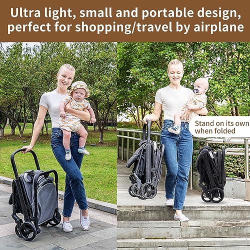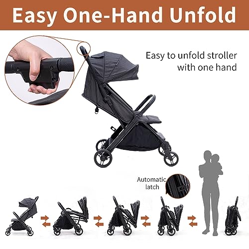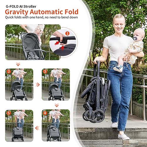 Effortless Gravity Automatic Fold: Our innovative Lightweight Baby Stroller features a gravity automatic fold mechanism, allowing you to effortlessly fold it with just one hand. No more bending down, making it convenient for parents on the go Easy One-Hand Unfold and Automatic Fold-Lock: With our stroller, unfolding is as easy as folding. Simply use one hand to unfold it effortlessly. Plus, the automatic fold-lock ensures that the stroller stays securely folded when not in use Compact and Ultra-Light Design: Designed to be small and portable, our Lightweight Baby Stroller is perfect for shopping or traveling by airplane. It folds super small 21.65*19.3*9.45 inches, making it easy to carry and store. Its ultra-lightweight construction makes lifting hassle-free, only 13lbs Adjustable Backrest, Footrest, and Canopy: We understand the importance of comfort for your little one. Our stroller features adjustable backrest and footrest positions, allowing you to find the perfect angle for your child's comfort. The adjustable canopy provides protection from the sun, and the peek-a-boo window allows you to keep an eye on your baby at all times Safety Certified: Rest assured knowing that our Lightweight Baby Stroller has passed rigorous safety tests. It meets the ASTM F833-21, CPSIA, and CPSA standards, ensuring the highest level of safety for your child