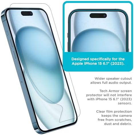 ULTIMATE SCREEN PROTECTION - Keep your iPhone 15 6.1-inch display protected from scratches, fingerprints, and smudges with Tech Armor's HD Clear Film Screen Protector. CLEAR VISIBILITY - Enjoy crystal clear visibility with this ultra-clear screen protector that won't hinder your phone's display quality. SENSITIVE TOUCH - This screen protector allows for full touchscreen sensitivity, so you can use your phone as you normally would. GREAT VALUE - This pack includes four screen protectors, so you'll always have a spare on hand. Share with family and friends or keep extras for yourself. EASY TO REMOVE - When it's time to replace your screen protector, simply peel it off - no sticky residue left behind! LIMITED LIFETIME WARRANTY - Trust in our device protection expertise with our limited lifetime warranty. We ensure that you are covered in the unlikely event that your product fails.