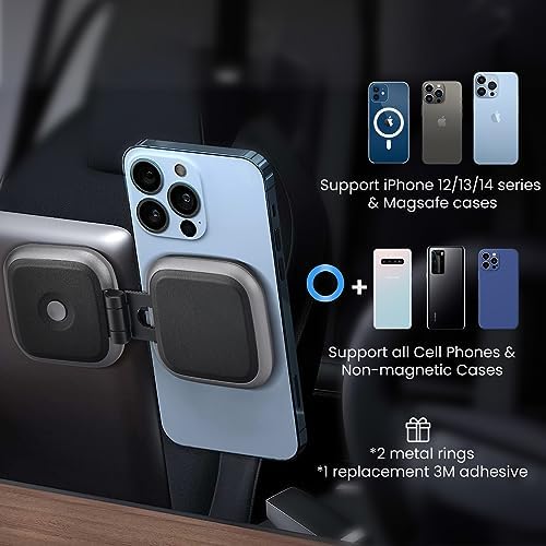 Powerful Magnetic Force : Upgrade the Built-in Ring Magnets Array with 16 ultra-powerful N52 magnets provides strong magnetic suction power, better corrosion resistance and more excellent magnetic performance. Even on rough roads, tesla magnetic phone mount can create a powerful attraction that firmly supports your device. Strongest Adhesion: Upgrade high-quality 3M adhesive for Tesla Model 3/X/Y/S Accessories Phone Mount, which is super sticky and long-lasting. So even in extreme environments, it will not fall off. The 3M adhesive on the base will not leave glue marks when removing it. Designed for Tesla Model 3/X/Y/S: This cell phone mount for car is designed for Tesla central touch screen. With the foldable design, you can hide it on the back of the central screen. It also can be mounted on the dashboard or windshile. Angle & Length Adjustable - The tesla phone holder is 360 degrees rotatable and the length of the premium metal arm can be extended 1.51 inches, allowing you to easily rotate your phone and adjust it to the perfect viewing angle for you. Work for All Phones: For phones without magsafe function, we provide an extra 2 metal rings, all you need to do is stick the metal ring on the back of your phone or case, so you can also enjoy a magsafe experience. For iphone 14, 13 and 12 series with magsafe function, the Tesla magnetic phone mount can be used directly. We provide 2 metal rings, user manual and extra 3M adhesive.( And we suggest you to wait it for 24 hours to use it after installation.)