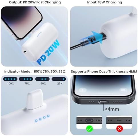 【2 Packs 5200mAh Portable Charger for iPhone】Single power bank is 5200mAh, best emergecy portable charging source for iPhone or AirPod, power up for your iPhone 13 from 20% to 70% in 30mins, which allows you enjoy the outside activities without worrying about your phone power off. You can use the type-C Cable(Package Included) to charge this mini power bank. 【Lightweight & Compact Power Bank】Ultra small and ultra lightweight, single unit dimensions is only 27*53*82mm (1.06''x2''x3.2''), single unit only weigh 0.19lb, easy to carry where you want to go and no need cables. And Built-in 4 LED indicators show the power left as 25%-50%-75%-100%. Package List: 5200mAh power bank x 2, USB C cable x 2, User manual x1, share with family and friend. 【Design for iPhone Series , No Need Cables, Plug & Play】Small power bank for iPhone, Portable charger compatible with iPhone 14/14 plus/14 Pro Max/13/13 Mini/13 Pro/12/12 Mini/12 Pro/11/XR/XS/X/SE/8/7/6 and Airpod. Plug-in and power on without extra cable for charging. This mini power bank is loved by young, which is the best choice for winter gift. 【Exclusive Pass-Through Technology Safety Protection】The battery pack supports bi-directional direct charging technology, which can charge your device at the same time as charging, and can also charge two devices at the same time. Our mini portable charger power bank is made of high-tech lithium battery, and ABS high-strength alloy fireproof material. Built-in intelligent protection systemto avoid over-discharge, over-charge, short-circuit, short-circuit or overload when heating, and automatical 【Pocket Battery Pack for Daily Use】Portable charger for iPhone is the best charging companion for travel and outdoor activities, pocket-sized body with large capacity allows you timely charging anytime and anywhere, include on plane. It also slides easily in your pocket, wallet and purse, allows you to easily use your phone with one hand. The portable pocket design is a great Gift for women and men at Christmas, Thanksgiving Day, Mother's Day, Valentine's Day, birthday.
